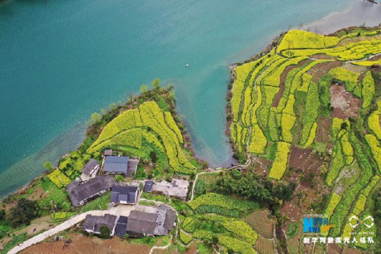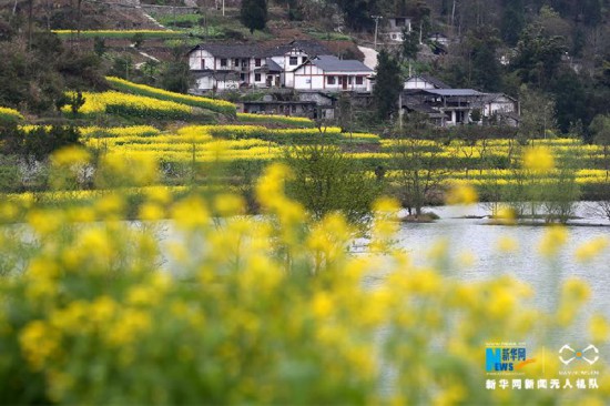 阿蓬江畔的油菜花掩映著民居,如詩如畫。新華網發(楊敏 攝)