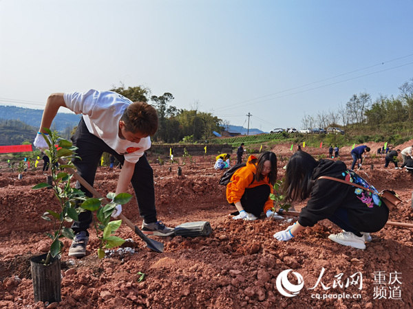 活動中,百余名黨員、團員來到渝北區木耳鎮金剛村、石鞋村觀摩該村在“雙十萬工程”、宜機化農業生產中的探索成效,并與村民共種經果林樹苗。在石鞋村的植樹現場,參與活動的黨員、團員們熱情高漲,經過一番辛勤勞動,300余株柑橘樹苗迎風而立,為春日的鄉村增添了一抹新綠。