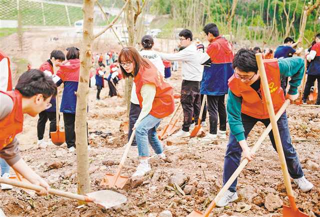 在江北區,200余名干部群眾來到明月山下的五寶鎮明月湖旁,栽種下藍花楹、黃桷蘭、水杉等景觀樹種500余株!袄蠋熀透改付冀逃覀円獝圩o樹木、森林,它們都是我們最好的朋友!眮碜灾貞c十八中高一七班的田瑤說,參加這樣的植樹活動很有意義,“我還會把活動現場圖片發到朋友圈,讓我身邊的人都來關注大自然!