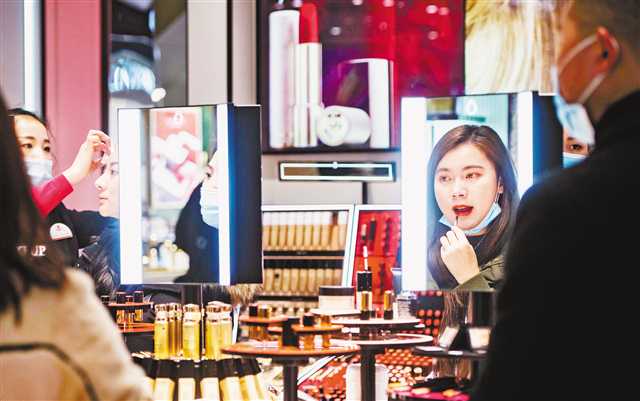 3月13日,夜幕降臨,觀音橋商圈依舊人流如織。新世紀百貨世紀新都一樓,化妝品專區擺放著口紅、面霜、香水等各種價格不菲的化妝品。30多歲的蔣小姐逛了一會兒后,購買了某知名品牌一款1000多元的面霜。