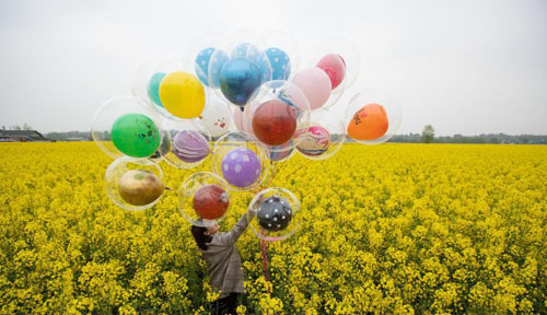 3月14日,游客在安州區秀水鎮龍泉村的油菜花海中留影。