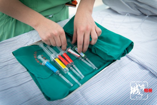 一踏進手術室,劉夢虓和同事們就開始了緊張而忙碌的準備工作。他們需要檢查各種設備儀器功能是否正常,還要準備各種藥物,每一種藥都要提前抽到針管里并貼上標簽備用!斑@樣的準備工作必須在患者進入手術室前完成,每次需要大概半個小時。只有手術前充分準備,才能臨危不亂!毙氯A網 耿駿宇 攝 陳雨 文