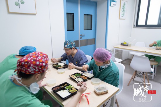 一臺手術中,麻醉醫生往往最早進手術室,最晚離開。加上晨會和每臺手術之間的準備時間,劉夢虓基本每天要在這個“悶罐”里呆上至少10個小時!叭绻中g難度大的話,一口氣站在手術臺邊7到8個小時也是家常便飯。所以,吃飯的時間,對我們而言是難得的放松時間!眲籼嵳f。新華網 耿駿宇 攝 陳雨 文