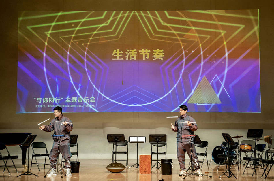 人民網重慶4月3日電 (劉政寧、姚於)這是一場特別的打擊樂表演:“樂器”主要是菜板、搟面杖、桶等生活用品搭配手碟和箱鼓。為了這場表演,兩位年輕人用一個多月時間,把身邊能發出不同聲音的東西都“琢磨”了一遍:吃飯的普通碗碟、各類煙灰缸、飯店上菜的按鈴、裝牙簽的盒子、甚至不同材質的垃圾桶……