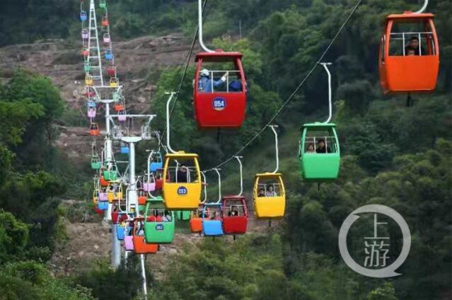 4月5日上午10點,景區9.99元索道入口處的游客排成了長龍。游客坐著跨江索道,登上美心紅酒小鎮景區的泡桐村山頂游山、觀水,玩得不亦樂乎。