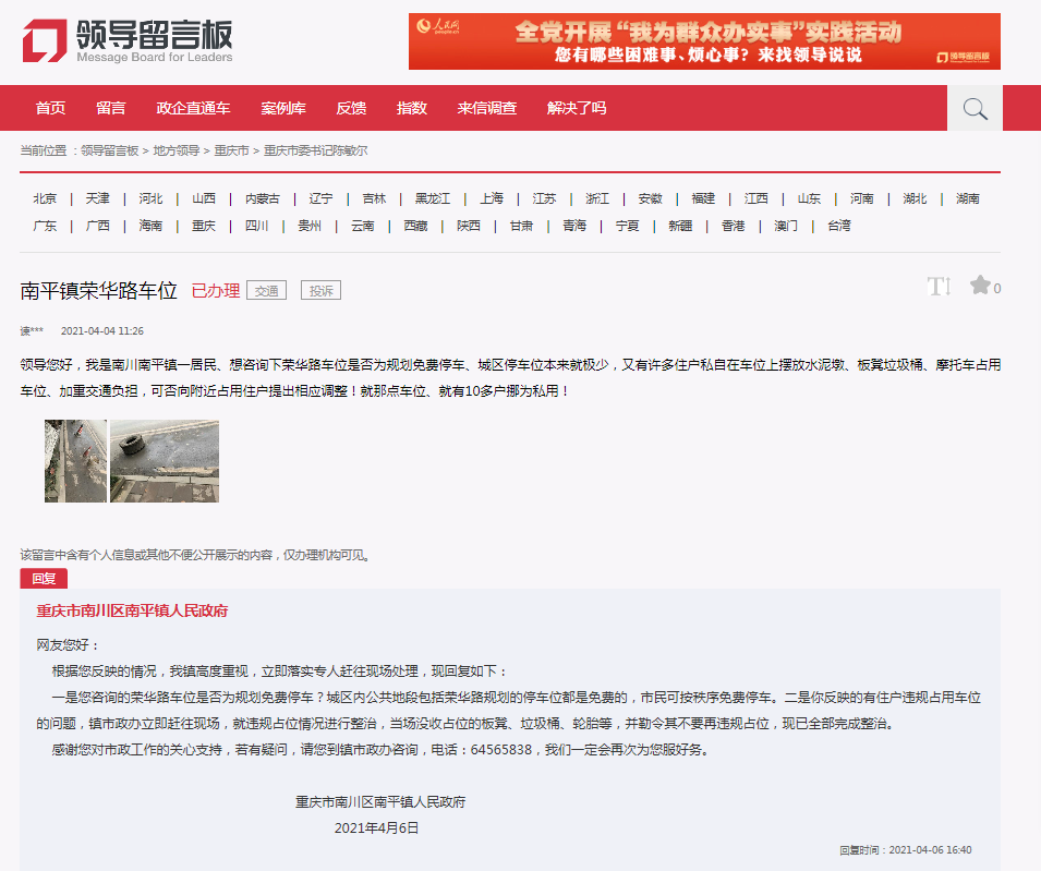 針對留言,南川區南平鎮政府回復稱:榮華路段屬于城區公共地段,市民可按秩序免費停車。對于有住戶違規占用車位的問題,南平鎮市政辦現場對違規占位情況進行了整治,當場沒收占位的私人物品,并勒令其不再違規占位。