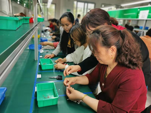 水口鎮清泉社區的鄉村振興車間是銅梁首個建成投產的車間。據水口鎮組織委員馮廷偉介紹,今年初,清泉社區利用一套86平方米的閑置房屋成立起電子產品有限公司,通過鎮黨委和區經信委牽線,成功對接重慶市昆凌電子科技有限公司,將該公司的串聯電子連接線的業務引入到鄉村車間里。這種手工活操作技術難度不大,簡單培訓就可以上崗,熟練后還可以帶回家做,工資實行計件制,非常適合農村務工困難群眾。今年2月車間一開張,就吸引了大量群眾前來咨詢、務工,至今已吸納了近50名務工群眾,月增收2千元到3千多元。