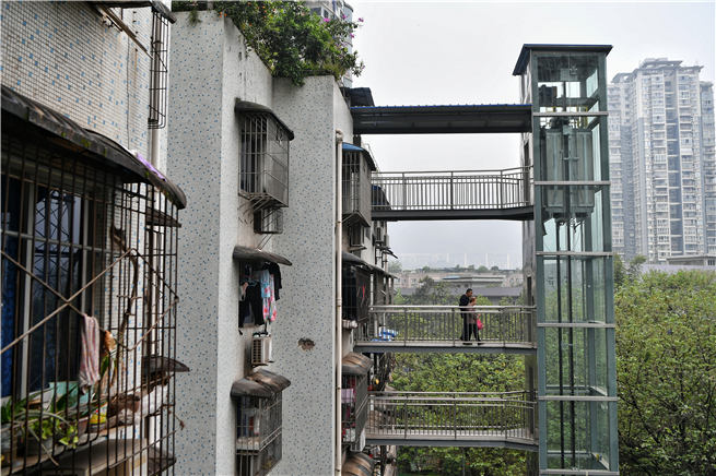 南岸區海棠溪街道,社區居民乘坐新安裝的電梯上下樓。郭旭 攝