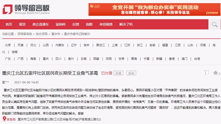 網友留言稱江北五里坪社區居民長期受工業臭氣侵擾