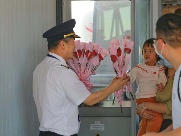 飛機平穩降落重慶機場后,李晶走出駕駛艙,站在艙門前與旅客握手告別,機組成員和旅客們把寫有祝福語的小紙條和鮮花送給李晶。