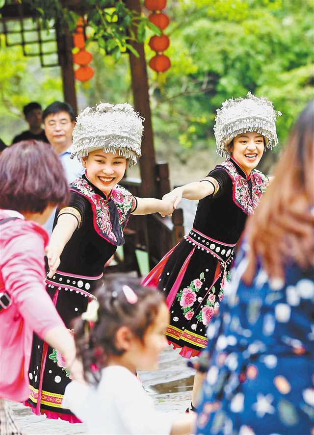 5月3日,在黔江區神龜峽景區,市民族歌舞團青年演員和游客一起跳土家族擺手舞。特約攝影 楊敏/視覺重慶