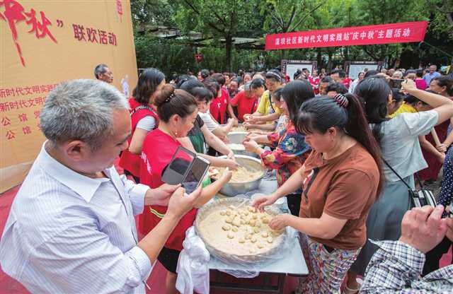 東城街道“好鄰居”志愿者和居民歡度中秋活動,現場制作傳統手工小糍粑