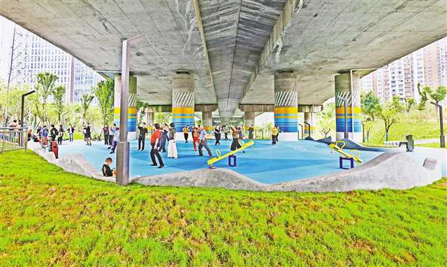 5月12日,渝北區龍塔街道渝魯社區,市民們在渝魯大道高架橋下健身、游玩。此處是以高架橋下閑置地為中心打造而成,占地18000平方米,集乒乓球、羽毛球、健身步道、兒童樂園等功能于一體,栽種了桂花、桃花、梧桐及香樟等景觀樹。此處已成為附近市民休閑、健身的新去處。
