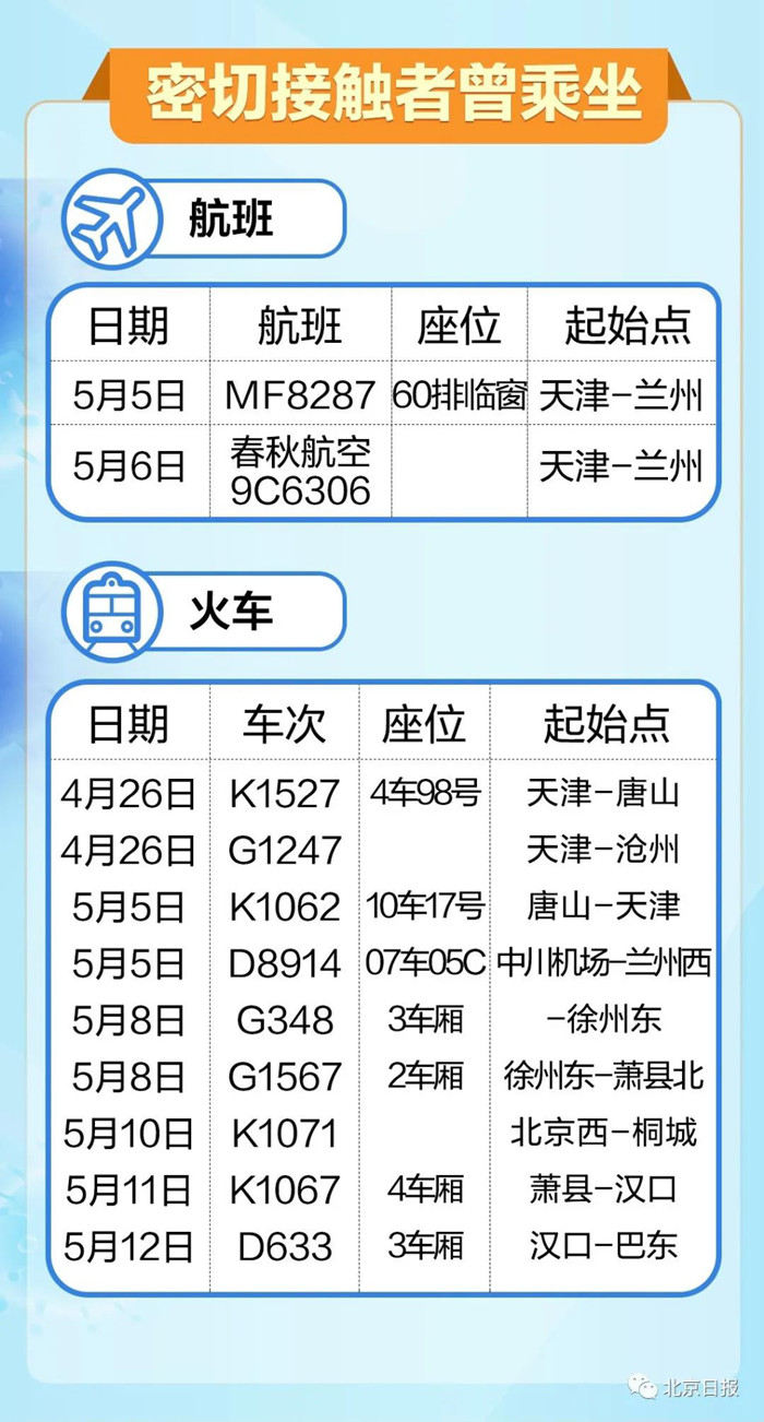 據公開報道,本輪疫情發生以來,各地發布了確診病例和密切接觸者的行程軌跡詳情,他們所乘坐的航班和火車班次如下,請乘坐這些航班和火車的人員及時向所在地社區(村委會)報告。
