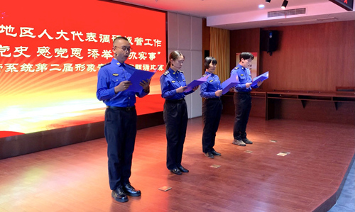 大賽以城管隊員一組文明執法展示拉開序幕。大賽中,7支參賽隊伍先后朗誦了《中華頌》《沁園春·雪》《可愛的祖國》等作品。街道分管副主任為朗誦比賽創作了“我驕傲,我是兩路口城管人”,在現場進行表演朗誦。