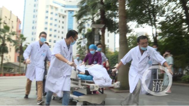 當日16點,護送病人的救護車一路風馳電掣,直奔重慶主城。但高速上比較擁堵,警方了解到情況后立即派出一輛警車在前面開道。17點10分,終于抵達醫院急診科,早已等待多時的搶救團隊立即將病人推到急救室,詢問觀測病情,建立靜脈通道,連接生命監測設備。這時病人的心率開始加快,情況非常不好!氨仨汃R上作CT搞清楚傷情!”在醫生引導下,消防官兵小心翼翼地將體外的鋼筋鋸斷,確保能完成CT檢查。