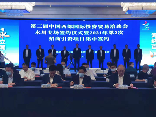 人民網重慶5月21日電 21日下午,第三屆中國西部國際投資貿易洽談會(簡稱“西洽會”)永川專場簽約儀式暨2021年第2次招商引資項目集中簽約儀式舉行,永川簽約69個項目,其中6個項目參與第三屆西洽會全市重大項目集中簽約。
