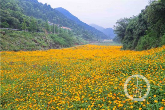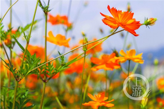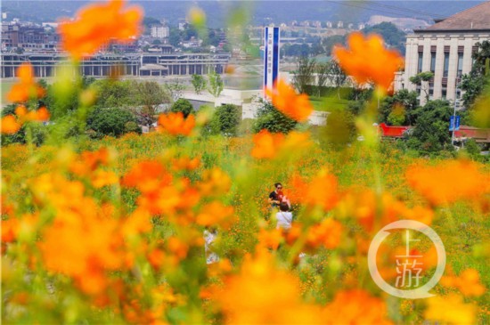 在不遠處,北濱二路的三洞橋風情街里也藏著一片金黃色的花海。在風情街下的邊坡上,一大片硫華菊正在盛開。雖然因為江北城消落區岸線環境綜合治理施工,市民無法進入邊坡,但僅是遠看已美不勝收。