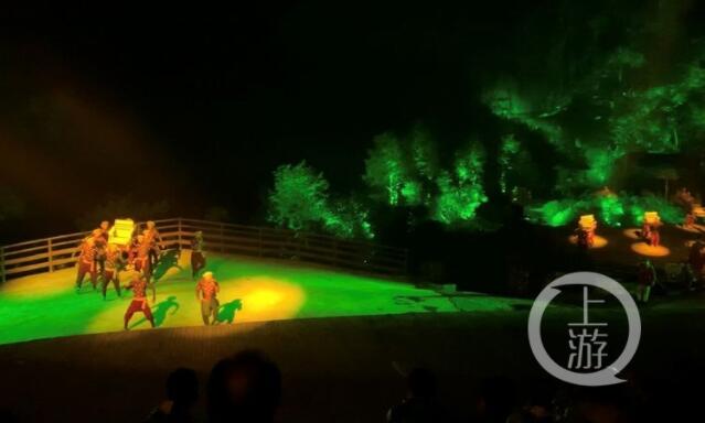 隨著夜幕降臨,在200米深的武隆仙女山桃園大峽谷,一場以U形槽谷為舞臺的實景演出徐徐拉開。