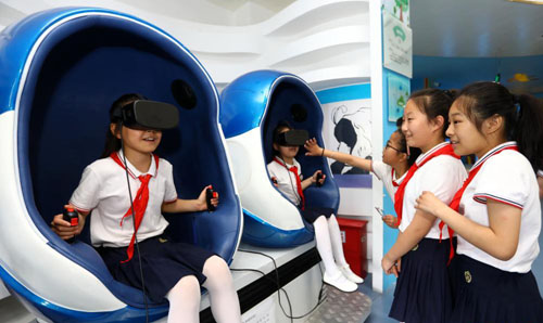 5月26日,淮北市古城路小學的學生在淮北市科技館體驗VR設備。新華社發(萬善朝 攝)