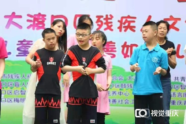 在梅明社工、德善社工等專業社工和志愿者組織下,大渡口區特教中心的小“演員們”身著節日的盛裝,登上屬于他們的舞臺,或舞蹈、或詩朗誦、或放聲高歌。孩子們雖然有些羞澀,舞姿不太優美,發音也不太標準,但和著歡快的音樂,他們表演得十分認真。