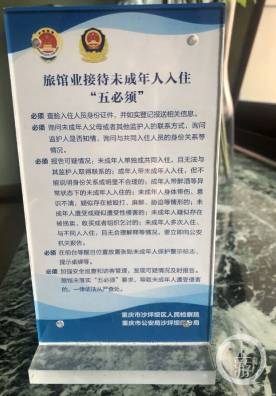 6月2日,重慶市檢察院發布消息,從今年5月開始,沙坪壩區1000余家旅館統一在登記臺的醒目位置放置《旅館業接待未成年人入住“五必須”》警示牌,并悉數簽訂了《強制報告責任人員權利義務告知書》、《強制報告責任承諾書》。此舉在全市尚屬首創。