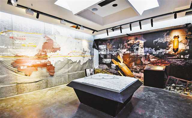 大轟炸遺址序廳,一面以大轟炸真實照片為基礎制作的大型浮雕展現了當時的場景:一片被炸成廢墟的街區中,殘垣斷壁上四個大字“愈炸愈強”,倔強有力、格外醒目。