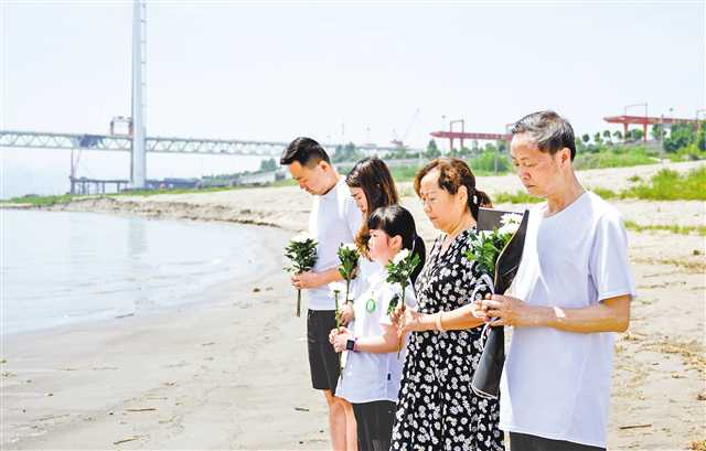六月五日,大渡口區萬發碼頭長江邊上,目睹了事發全過程的王顯才老人帶著全家前來悼念王紅旭老師。記者 解小溪 攝\視覺重慶