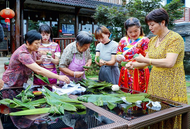 6月13日,在浙江省湖州市長興縣小浦鎮方一村一家民宿,當地村民和游客一起制作當地傳統美食“烏米端午粽”。