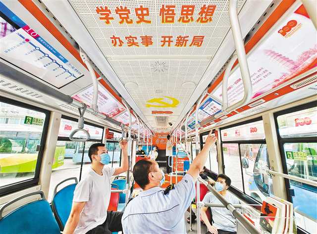 作為黨史學習教育宣傳的移動平臺,該路公交車配有黨史電子圖書館、建黨100周年祝福留言板、黨史書籍讀書角等,駕駛員擔任黨史宣講員,為乘客簡要介紹沿途紅色景點、革命故事等。目前,“黨史進車廂”已在我市14條公交線路的58輛公交車上線,公交集團還將陸續推出“青年奮進號”等主題車廂,讓市民對黨史有更多了解。