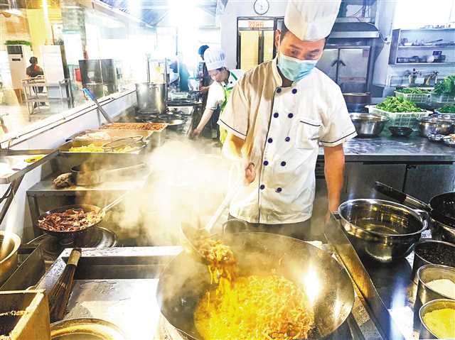 6月16日晚,阿蓬記黔江雞雜總店的廚房內,一名廚師正在炒制雞雜。(本版圖片除署名外均由黔江區委宣傳部提供)
