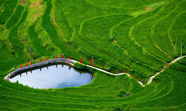 6月8日,在重慶市酉陽縣花田鄉何家巖村,萬畝梯田層層疊疊綠意盎然,蜿蜒的田埂在云霧中若隱若現,美不勝收。