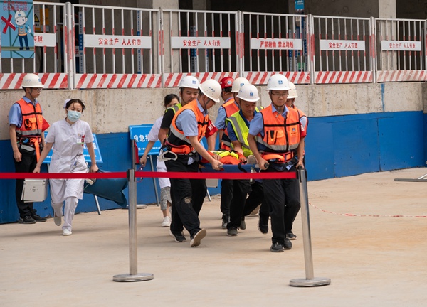 上午9:00,現場總指揮拉響警報后,演練準時開始。本次演練模擬場景為現場工人違規操作導致高墜事故發生,項目立即啟動應急預案,警戒疏散組封鎖事故現場,疏散圍觀工人,疏通安全通道,技術保障組根據現場情況迅速制定初步營救方案,應急搶險組攜帶相應工具展開救援,醫療救護組攜帶相關藥品迅速開展初步診斷和急救準備工作,通訊聯絡組迅速撥打120,獲取外援單位支持,后勤保障組保障物資供應,護送受傷人員到就近醫院治療。