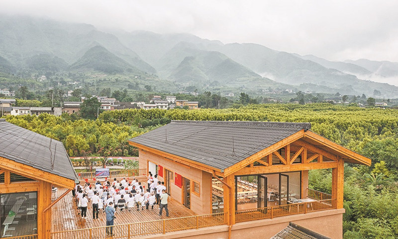 7月1日,中國美麗休閑鄉村北碚區柳蔭鎮東升村,黨員干部和村民們聚集在新修建的游客接待中心,一起觀看慶祝中國共產黨成立100周年大會直播。記者 萬難 攝/視覺重慶
