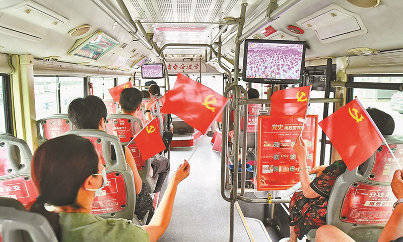 7月1日,南岸區彈子石338路“青春奮進號”公交車上,乘客觀看慶祝中國共產黨成立100周年大會直播。特約攝影 郭旭/視覺重慶