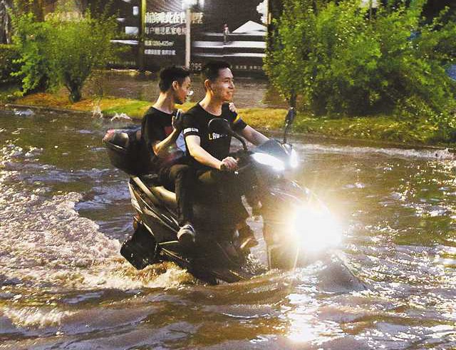 7月12日凌晨,南濱路,市民騎摩托車小心翼翼地涉水前行。特約攝影 鐘志兵/視覺重慶