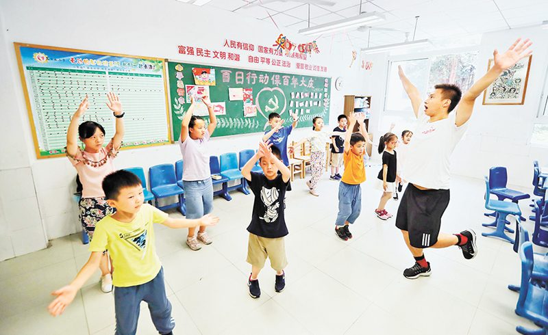 7月14日,沙坪壩區鳳鳴山小學,志愿者在教暑假托管班的孩子們學習健身操。為解決一些家庭假期子女看護難題,沙坪壩區實施“青仔益起來”公益托護計劃,依托學校和社區微型少年宮開辦寒暑假期公益托護班,向轄區5—12歲在讀學生開放。由志愿者以及具備資質的社會組織組成師資隊伍,開設豐富多樣的課程活動,促進青少年全面健康成長。