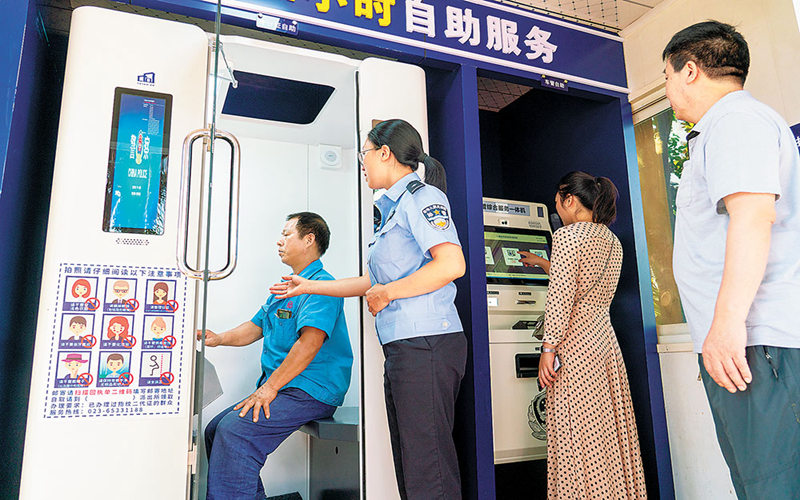 7月22日,永川區火車站廣場,市民在便民自助服務點的自助機上辦理戶政和交管業務。