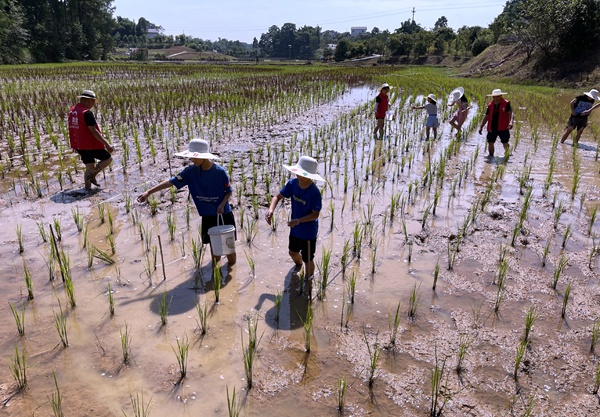 人民網重慶7月31日電 31日,渝北興隆鎮;蚀遛r業專業合作社的晚稻田里迎來了一群小農人,他們脫下鞋子,挽起褲腿,在叔叔伯伯的帶領下,為稻田施肥、除草。他們是參加“暑期課堂”的中小學生。