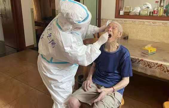 “你們本來就很累了,這么大熱天還上門來為我們服務,謝謝你們!”入戶核酸采樣完成,87歲高齡的吳大爺和家屬們連聲道謝,向入戶采樣的工作人員表示由衷的感謝。