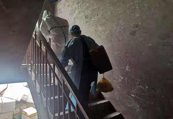 通宵達旦的核酸采樣工作已令醫護人員們疲憊不堪,每上一層樓梯都顯得很吃力,但醫護人員們仍然在高溫下堅持著,穿著厚厚防護服繼續開展入戶核酸采樣。