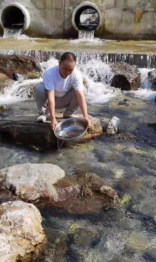 該條娃娃魚不大,長約40厘米,體重約1.5公斤,通過一晚上的喂養,楊元林確認其沒有明顯外傷。8月5日上午,楊元林又把娃娃魚重新放回平定河中。