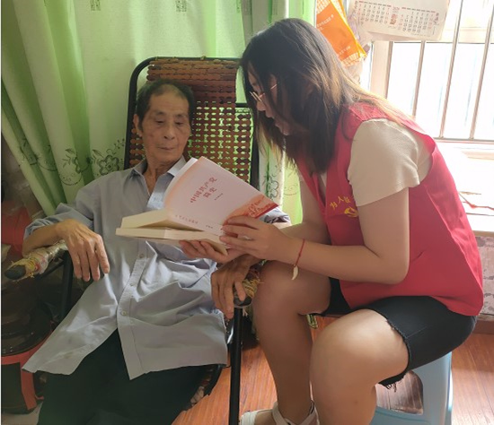 在石坪社區,不少黨員志愿者主動要求當“紅色網格員”,從而可以深入基層及時發現群眾的糟心事煩心事。今年82歲的老黨員楊光華行動不便,認字也十分困難,心里卻一直想再讀讀黨史。了解到這一情況后,志愿者付梨手捧《中國共產黨簡史》,上門為楊光華讀書。截至目前,付梨已上門32天,每次為老黨員朗讀半個小時。