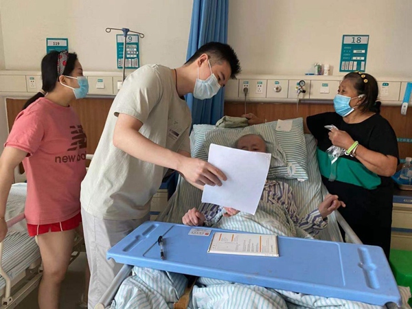 第一稅務所干部為住院老人講解房屋產權過戶流程。璧山區黨史學習教育領導小組辦公室供圖