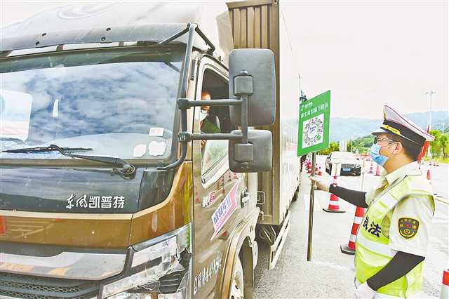 8月10日,巫山縣交通綜合行政執法人員聯合衛生健康人員在G42高速公路渝鄂省界巫山服務區疫情防控點,對過往車輛進行行程掃碼檢測。連日來,巫山縣以守住“渝東大門”機場、車站、碼頭等重要交通站場和日常交通工具為重點,相繼在G42高速公路巫山服務區以及城區、鄉鎮等主要道路,設置7個路面防控組,對過往車輛做到行程碼必查。特約攝影 王忠虎/視覺重慶
