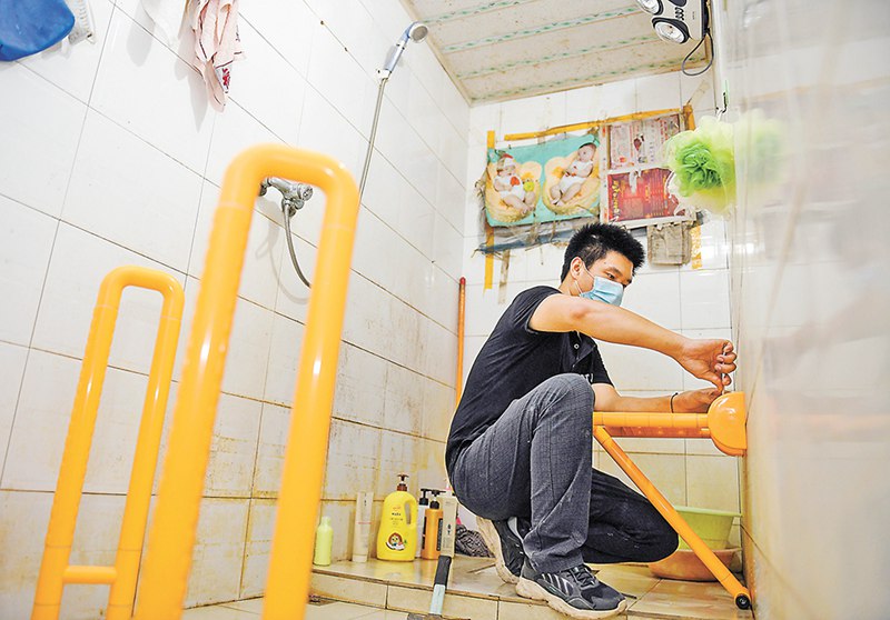 8月12日,在重慶高新區走馬鎮銀崗村11社的張永蘭家,工作人員正在衛生間為她安裝折疊浴凳。