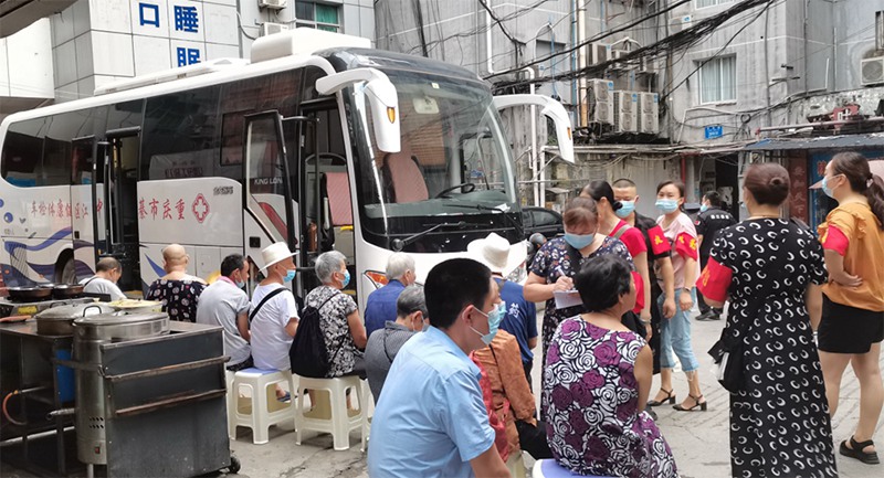 為方便居民接種疫苗,近日,我區組織新冠疫苗接種車來到各社區,將疫苗接種服務送到居民家門口。圖為接種車開到文龍街道石佛崗社區,居民們正有序排隊接種疫苗。