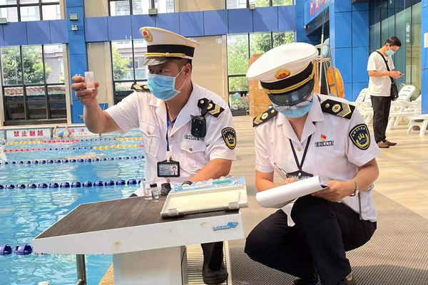 衛生監督員檢查游泳場所衛生現場。榮昌區衛生健康執法支隊供圖