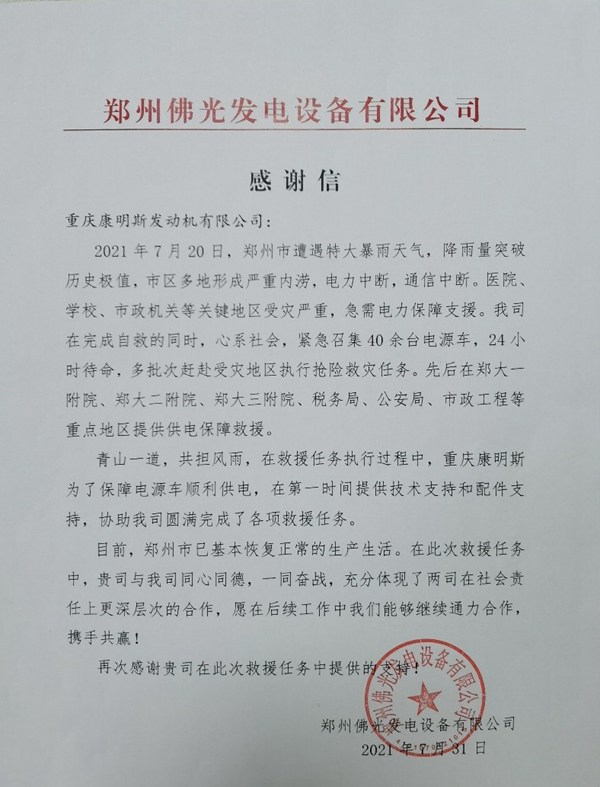 人民網重慶8月18日電 近日,重慶康明斯收到一封來自河南鄭州一企業的感謝信,對公司第一時間提供技術支持和配件支持、主動履行社會責任、以實際行動全力支持抗洪救援表示感謝。