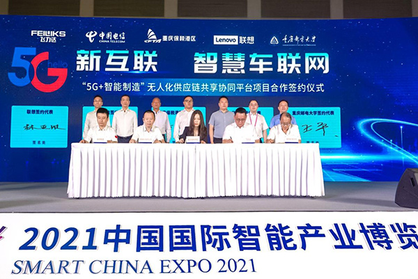人民網重慶8月23日電 8月23日,在2021中國國際智能產業博覽會上,由重慶兩路寸灘保稅港區管委會、中國電信重慶公司、聯想集團、飛力達、重慶郵電大學合作打造的“5G+智能制造”無人化供應鏈共享協同平臺正式簽約發布。